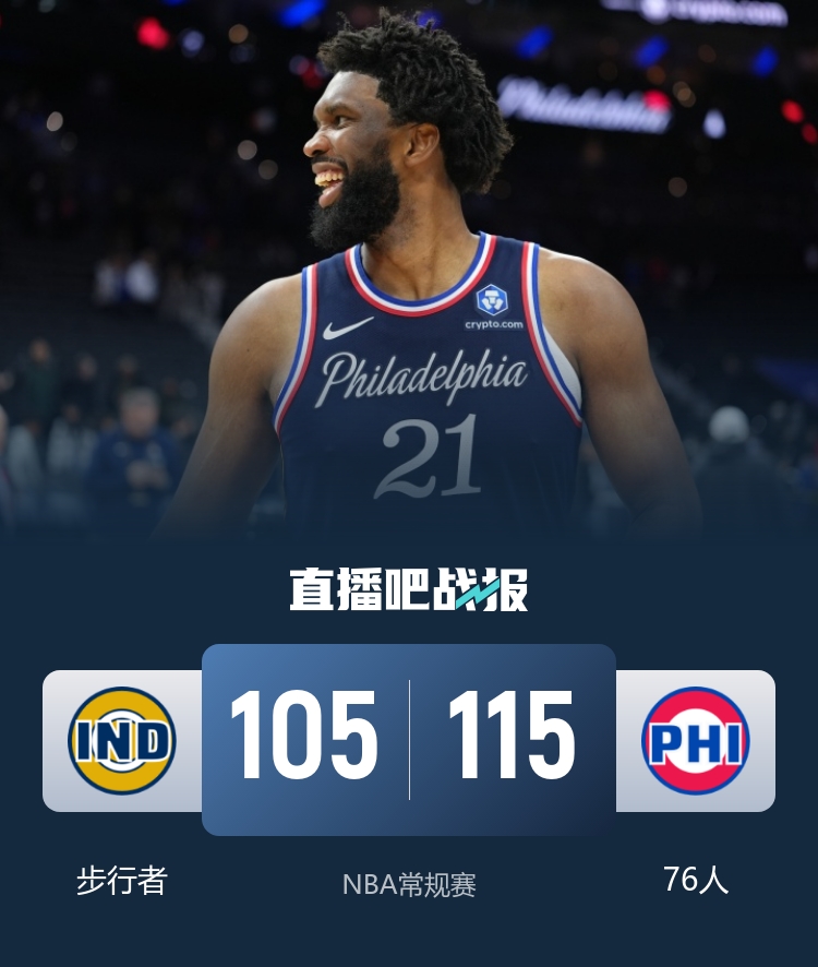 比赛开场,乔治和埃奇库姆撑起球队进攻重任,连续取分建立领先,但步行者这边众人发力也很快给予回应,双方陷入拉锯战,首节结束76人34-31领先。次节回来,埃奇库姆延续进攻状态,同时恩比德大发神威,在中距离位置予取予求,随着准压哨三分投中,恩比德单节15分帮助球队63-58领先结束半场。易边再战,恩比德继续自己的得分表现,帮助球队领先到两位数,但随后效率有所下降,步行者稳扎稳打完成反超,乔治再次站出来连续得分稳住局势,三节结束两队战成90平。末节回来,西亚卡姆开始发力,连续得分,双方开始交替领先,终场结束前恩比德乔治轮番发力,76人拉开比分,将胜利收入囊中,115-105取胜。